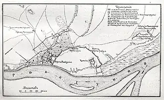 В 11 часов ночи 20 апреля войска двинулись к валам крепости. Колонна князя В. В. Вяземского сбилась в темноте с пути, «почти вся провалилась в погреба сгоревших домов и, приняв их за ров крепости, начала стрелять и совершенно расстроилась, даже не дойдя до рва. Стали ставить лестницы, но они оказались короткими».[2] Русские солдаты подверглась уничтожающему расстрелу со стороны осажденных турок. В 13 егерском полку из 1100 человек было потеряно убитыми и ранеными около 900 солдат и офицеров.