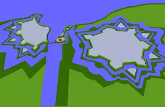 ![]() Реконструкция крепости Делфзейл при отливе в 1814 году | |||
