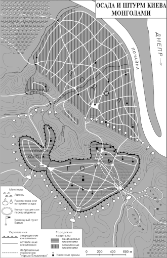 Согласно описанию Плано Карпини, монголы при взятии городов полностью оцепляли их. При этом они изматывали обороняющихся, не прекращая подступов к городу, чередуя наступающие отряды. Параллельно осадные машины монгол (пороки) планомерно день и ночь били по стенам, разрушая их. Хотя укрепления Киева были весьма внушительными, они были сооружены в XI веке, в эпоху, когда крепости брались или внезапным набегом, или длительной пассивной осадой. На сопротивление штурму с применением осадных машин киевские укрепления рассчитаны не были.