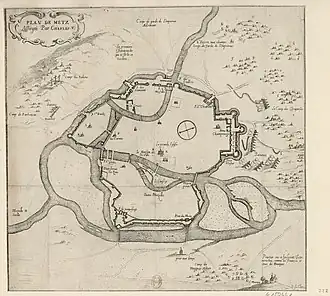 Мец был окружен с запада, севера и востока реками Мозелем и Сеем, сливавшимися на его северо-западной окраине. Две широкие и полноводные реки, разделенные островами на несколько рукавов, создавали естественную защиту на трех направлениях, и только с юга широкая равнина давала доступ к крепости. Со стороны рек укрепления представляли собой простую стену, усиленную инженерными сооружениями на северо-востоке, где в сторону Сея выходили Сен-Барбские, Немецкие и Мецкие ворота. Основные оборонительные сооружения располагались на юге, от ворот Сен-Тибо, выходящих на Сей, до Адской башни и платформы Сен-Мари — на Мозель. В центре этого участка находились Шампанские ворота[4].