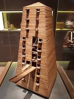 После серии неудач в штурмах с моря Деметрий решил захватить Родос с суши. Для этой цели Эпимах сконструировал громадную осадную башню-гелеполу, которая своими размерами поразила современников. Эту башню в различных вариациях описывали сразу несколько античных авторов — Диодор Сицилийский[33], Плутарх[34], Афиней Механик[35], Витрувий[36], Аммиан Марцеллин[37] и др.[38] Конструкция, которую в течение зимы 305/304 года до н. э. сооружали 30 тысяч воинов, представляла собой укреплённую подвижную башню высотой в несколько десятков метров. Афиней Механик давал следующие её характеристики — около 40 метров в высоту, 22 метра в ширину, способность выдержать удары камней весом в 3 таланта (около 120 кг). Эту конструкцию весом около 150 тонн приводили в движение более трёх тысяч воинов[38].