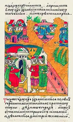 ![]() И устремишася вси на безбожных, и изыдоша из града не токмо воеводы и все мужи, и жены, восприемше мужескую храбрость, и младые дети, и многих татар под градом поби, и царева шурина убиша, князя Камбирдея, и наряд пушечной и ядра, и стрелы, и зелие многое, на разорение града привезенное, взяша православнии. Миниатюра Лицевого летописного свода. | |||