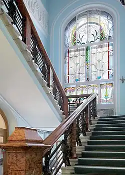 На оформление внутреннего убранства в смете были заложены значительные средства. Чтобы привлечь будущих покупателей, интерьеры были намеренно решены в разных стилях, от классицизма к модерну[7]. Витражи, живопись и лепнина украшали практически все помещения особняка. В отделке были использованы такие дорогие материалы, как мрамор, оникс, карельская берёза. До настоящего времени сохранилась большая часть декора. К парадному второму этажу ведёт трёхмаршевая главная лестница, над которой расположен плафон с изображением сфинкса и сложным орнаментальным узором[17]. Лестница освещена ростовыми витражными окнами, перила украшают характерные для символики Кекушева бронзовые маски львов[18][2].