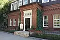 Этажи дома разделены рельефным кирпичным карнизом в форме декоративных кронштейнов.