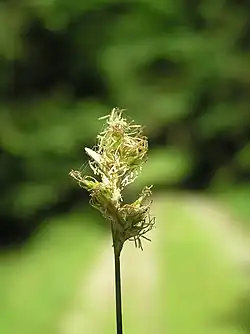 Верхние колоски андрогинные или тычиночные, реже пестичные, средние андрогинные или тычиночные, нижние пестичные или андрогинные. Колоски продолговато-обратнояйцевидные, позже булавовидные, несколько изогнутые, бледно-зелёные, в числе 5—8 скучены в рыхлый продолговатый колос. Чешуи яйцевидные, зелёные, слегка ржавые, островатые, короче мешочков. Мешочки перепончатые, ланцетные, длиной (3)3,5[1]—4(5[1]) мм, плоско-выпуклые, зелёные, с широким зубчатым краем и с 5—8[1] неясными жилками, в основании округлые, клиновидно-суженные в плоский двузубчатый носик, зрелые изогнутые наружу, часто недоразвитые или без плодов[1].