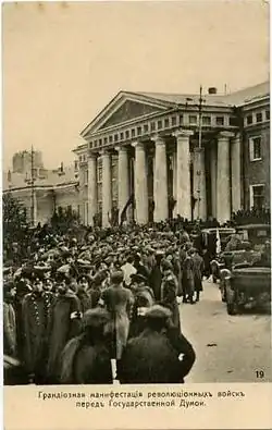 Государственная дума Российской империи практически перестала существовать после событий Февральской революции. Депутаты собирались лишь на «частные совещания», а окончательно Дума была распущена 6 (19) октября 1917 года[42].