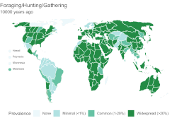 Переход от охоты и собирательства к земледелию не обязательно является односторонним процессом. Утверждалось, что охота и собирательство представляют собой адаптивную стратегию, которую все ещё можно использовать, если это необходимо, когда изменение окружающей среды вызывает у земледельцев сильный пищевой стресс[66]. На самом деле, иногда бывает трудно провести четкую грань между земледельческим обществом и обществом охотников-собирателей, особенно с учётом повсеместного распространения земледелия и, как следствие, культурного распространения, которое произошло за последние 10 000 лет[67].