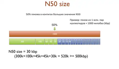 Статистика N50 характеризует качество сборки с точки зрения её непрерывности. N50 определяется как самый короткий контиг при суммировании длин минимального числа контигов для получения суммы, большей или равной половине длины сборки генома. Можно воспринимать N50 как центр масс распределения длин контигов. Суммарная длина последовательностей контигов длиннее, чем N50, примерно равна суммарной длине последовательностей короче N50.