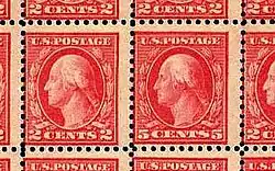 При печати стандартной серии с профилем Джорджа Вашингтона часть клише красной двухцентовой марки было заменено аналогичным клише пятицентовой — без исправления цифр в нижних углах. В результате в листах по 400 двухцентовиков на свет появились и такие же красные пятицентовые марки (их нормальный цвет — синий). Плюс к тому часть тиража оказалась без перфорации. Ныне каталожная цена неперфорированного листа двухцентовиков с пятицентовым вкраплением (а их известно всего 48) — 24 000 долларов США (каждый пятицентовый экземпляр — 500). Версия с зубцовкой (таких марок на руках филателистов более 100 тысяч штук) стоит 350—400 долларов для хорошо отцентрованного экземпляра.