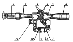 1-наглазник; 2-окуляр; 3-винты; 4-маховики; 5-корпус с кронштейном крепления; 6-объектив; 7-включатель подсветки; 8-зажимной винт; 9-регулировочная гайка; 10-фиксатор; 11-крышка отсека питания