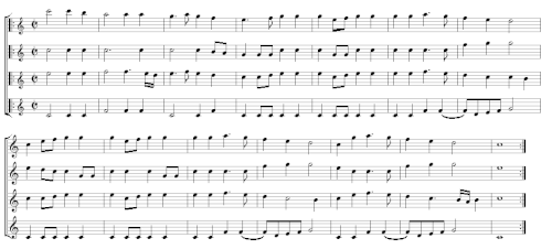 - ритм аккомпанирующего барабана обычно 1/2-1/4-1/4 или подобный, такая же структура обычно повторяется в мелодии;