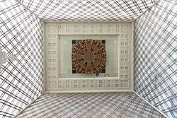 У павильона есть полноценный задний фасад. Колонны и полуколонны, почти по всей высоте украшенные лепниной, образуют портик, над которым виднеется объём всё того же стеклянного куба[2].
