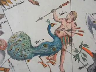 Павлин в одном из древнегреческих мифов связан с Аргусом. В этом мифе Ио, прекрасную принцессу города Аргос, соблазнил Зевс, и превратил её в белую корову, чтобы ввести в заблуждение свою ревнивую жену Геру. Однако Гера попросила, чтобы Зевс подарил ей эту корову и поместила её под неусыпную охрану Аргуса, который привязал её к оливковому дереву в роще Геры. У Аргуса было сто глаз, из которых он закрывал не больше двух во время сна. Под руководством Зевса Гермес с помощью волшебной лиры сумел так усыпить Аргуса, что тот закрыл все свои глаза, и Гермес убил его. В память о службе, которую сослужил ей Аргус, Гера поместила его глаза на хвост павлина[8]. Очень похожую версию мифа рассказывает Овидий в своих «Метаморфозах», хотя имена персонажей там романизированы. Гибель Аргуса там имеет явную звёздную ссылку: глаза Аргуса, которые дочь Сатурна помещает на хвост своей птицы, названы «глазками звездистыми»[9]. Непонятно, имели ли в виду греческий миф голландские астрономы, когда придумывали созвездие Павлин, но, принимая во внимание другие созвездия, введённые Планциусом через Кейзера и де Хаутмана, «павлин» в новом созвездии, вероятно, относится к зелёному павлину, которого мореплаватели могли встретить в Индонезии, а не наиболее многочисленному обыкновенному павлину[10].