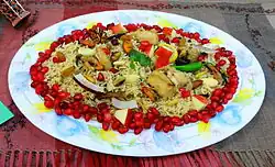 Популярны также супы дал и шурпа; рис с машем кичари, рис с мясом или рыбой бирьяни, фрикадельки кюфта, рагу корма, запечённые цыплята, кебабы, рис с фасолью раджма, каша халим. Каждое застолье обязательно включает блюдо из овощей, приготовленных с йогуртом «дахи»[5] и множество соусов[12]. Праздничную кашмирскую трапезу составляют блюда вазван.