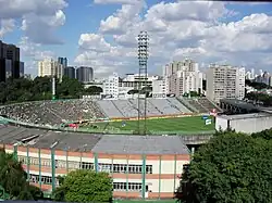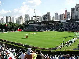 | Стадион в 2010 году | Матч на стадионе | Баннер «Палмейраса» на стадионе в 2008 году | Разрушенные трибуны после сноса. 2011 год |