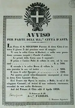 С момента основания гонки жители Асти боролись за право участвовать в Палио в день памяти своего святого покровителя, Секунда Астийского, епископа Асти, принявшего мученическую смерть 30 марта 119 года. Эта гонка упоминается во многих договорах и союзных соглашениях с различными суверенами, покровителями и правителями.