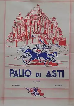 Где-то между 1440 и 1464 годами Карл, герцог Орлеанский, посетив графство Асти, унаследованное им от матери Валентины Висконти, в качестве приза предложил палио из малинового бархата, украшенное тремя золотыми лилиями на синем фоне.