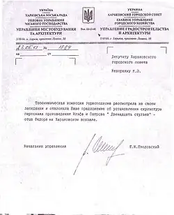 - ↑ В Харькове снесли скульптуры персонажей из Романа Ильфа и Петрова "Двенадцать стульев". strana.today (21 сентября 2024). Дата обращения: 21 сентября 2024.