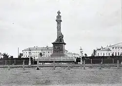 Почти десять лет колонна была закрыта деревянным обелиском, увенчанным красным флагом. На четырёх сторонах обелиска были укреплены портреты вождей российского и международного революционного движения. Постамент использовался как трибуна во время революционных торжеств. К 1928 году деревянный обелиск пришел в ветхое состояние, и городские власти распорядились свалить колонну с постамента и закопать тут же в сквере. Окончательный снос памятника был произведен в 1934 году. Гранитная облицовка постамента была разбита на щебень и использована для мощения «нескольких метров мостовой на площади и по Советской улице».[16]