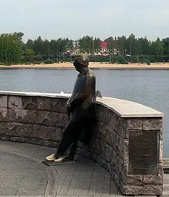 Памятник на фоне Хлебной биржи- Памятник Льву Ошанину на фоне реки Волга