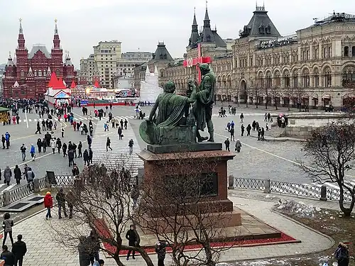 ![]() Памятник Минину (слева) и Пожарскому (справа). Фото 2015 года | |