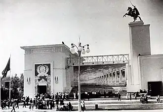 Скульптура конного комдива была изготовлена в Москве, где была установлена на Выставке достижений народного хозяйства перед зданием Приволжского павильона. Выполнена она была из армированного железобетона. Авторами выступили скульптор П. А. Баландин и архитектор В. И. Морозов.