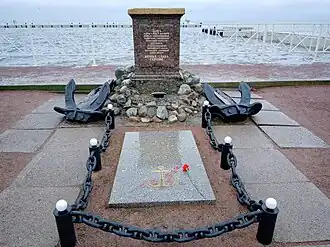 Спереди памятник ограждён чугунной якорной цепью, между ней и стелой лежит памятная гранитная плита-надгробие, под которой похоронены останки обнаруженных на берегу погибших моряков[5]. На ней выгравированы якорь и пальмовая ветвь. Также на неё высечен текст: