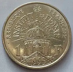| 1995 | Никель | 6 г | 24 мм | 1995 | рубчатый | Номинал и изображение института искусств | Герб института искусств | Париж | |||