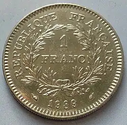 | 1 франк. 200 лет Французской Республике. Дизайнер: Аверс — Огустен Дюпре, Реверс — Пьер-Жозеф Тиолиер | |||||||||||