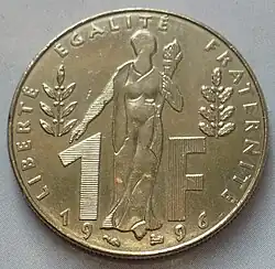 | 1996 | Никель | 6 г | 24 мм | 1996 | рубчатый | Номинал, женская фигура с факелом | Портрет Жака Рюефа | Париж | |||