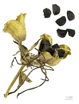 Плод — овально-треугольная трёхгнёздная коробочка.