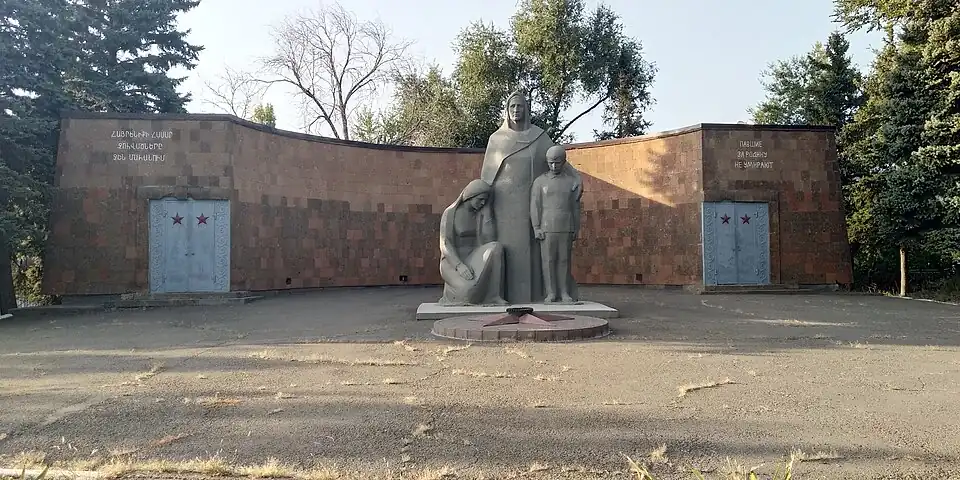 Комплекс представляет собой скульптурную группу и полукруглую постройку пантеона из тёмного туфа. Вверху скорбит пожилая женщина. Левой рукой она придерживает внука, правой — невестку. Самых дорогих мужчин: сына, мужа, отца — забрала война.