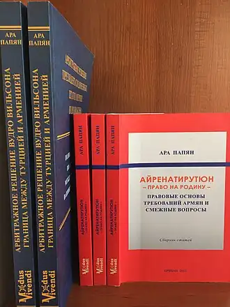 - 1 2 3 4 5 6 7 8 9 Ара Папян. Айренатирутюн − право на Родину − правовые основы требований армян и смежные вопросы. — Ереван: Асогик, 2012. — С. 337. — 338 с. — ISBN 978-9939-50-204-5.