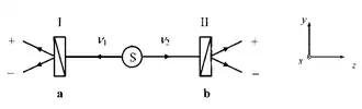 Для совместного обнаружения и в каналах + или − поляризаторов I или II с направлениями и квантовая механика предсказывает[19] вероятности :