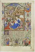| Мастер Нарбоннского парамана и сотоварищи | «Прекрасный часослов Богоматери» Жана Беррийского «фр. Les Très Belles Heures de Notre-Dame de Jean de Berry» | 1389—1409 | Пергамент, 290 × 205 мм; 126 листов. | НБФ; «ms. n. a. lat. 3093»; см. | + илл. |
