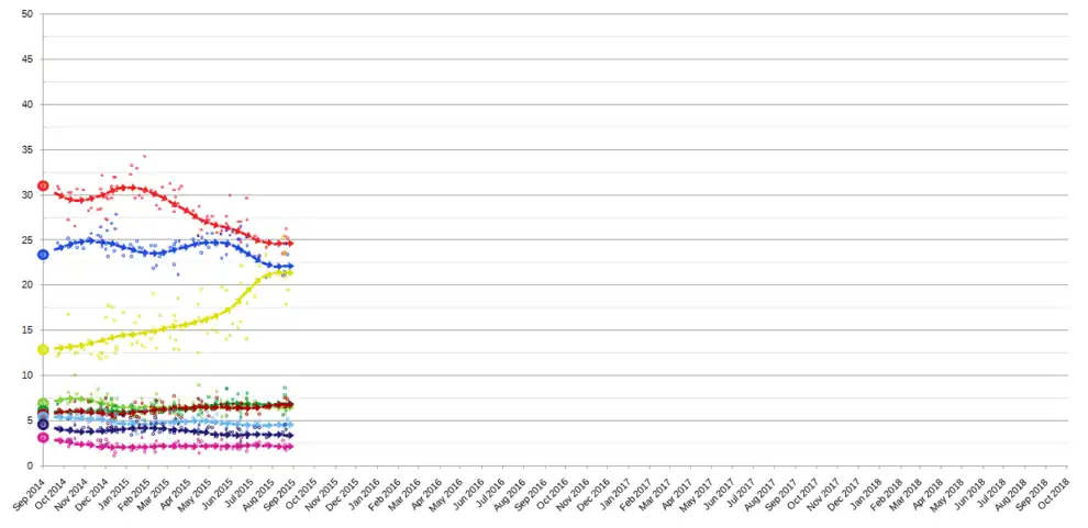 | 14 Sep 2014 | General Election Архивная копия от 15 февраля 2018 на Wayback Machine | 31.0 | 23.3 | 12.9 | 6.9 | 6.1 | 5.7 | 5.4 | 4.6 | 3.1 | 1.0 | 7.7 |