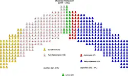| В Верховную Раду VI созыва прошли 5 партий: «Партия регионов», «Блок Юлии Тимошенко», «Наша Украина — Народная самооборона», «Коммунистическая партия Украины», «Блок Литвина». Коалицию создали партии НУНС и БЮТ получив в общей сложности 228 мандатов при минимальном пороге в 226 мандатов. | |||