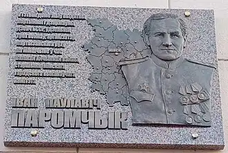 - Мемориальная доска установлена на фасаде дома № 28 по проспекту Независимости в Минске, в котором жил Иван Паромчик.