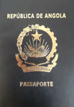 Паспорт гражданина Анголы чёрного цвета с гербом Анголы по центру и надписями REPUBLICA DE ANGOLA (Республика Ангола) вверху, PASSAPORTE (Паспорт) внизу.