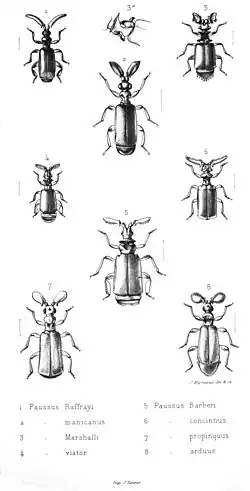 - ↑ Le Masne G. (1961) Observations sur le comportement de Paussus favieri Fairm., hôte de la fourmiPheidole pallidulaNyl. Ann Fac Sci Marseille 31:111—130
