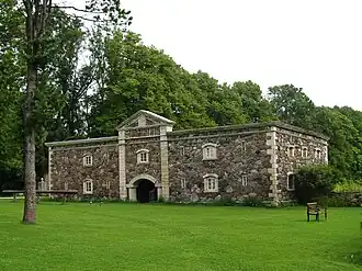 - амбар, построен в 1879 году. Двухэтажное, декоративно расчленённое здание из бутового камня. Под кровлей широкий карниз. Центральная часть выступает в виде ризалита, выложенного доломитовыми камнями. Слегка закруглённая и невысокая притолока из доломитовых блоков, оформляющая вход в здание, опирается на две небольшие колонны с тяжёлыми плитами наверху. Выполненный в классическом стиле ризалит завершается имитирующим каркас горизонтальным карнизом и треугольным фронтоном с камнем, на котором вырезана дата строительства. Закруглённые сверху окна выделены доломитовыми камнями. При инспектировании 27 июня 2023 года его состояние было плохим[12];