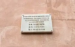 Мемориальная доска учёным Н. Т. Пенгитову, В. М. Тарасовой и В. Ф. Пашукову на доме № 42 по улице Кремлёвской в Йошкар-ОлеМемориальная доска на доме в Йошкар-Оле (ул. Коммунистическая, 42).