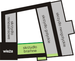 Вход в готическое крыло сперва находился посередине фасада со стороны двора (сейчас он расположен в надбрамном крыле). Нынешний вид фасада со стороны двора был реализован во время ремонтно-модернизационных работ в 1902 году на основе иконографических источников и внешнего вида сохранившейся верхней северной части[2]. Во время ремонта в 1935—1940 годах крыло было слегка вытянуто с южной стороны и была выстроена новая щипцевая стена. Щипцовая стена с северной стороны сохранила позднеготические элементы (включая окно, увенчанное аркой)[2].