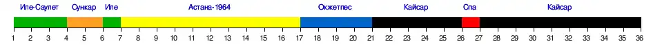 | Астана-1964 | 2 | 6 | 6 | 4 | 3 | 2 | 1 | 1 | 1 | 1 | 1 | 1 | 1 | 1 | 1 | 1 | 2 | 3 | 5 | 4 | 6 | 8 | 7 | 7 | 7 | 8 | 7 | 8 | 8 | 8 | 8 | 8 | 8 | 7 | 7 | 7 |