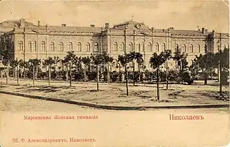 Своё начало гимназия берет с 1863 года, когда в городе было открыто Николаевское женское училище 1-го разряда. С сентября 1870 года учебное заведение называлось «Николаевская первая Мариинская женская гимназия». Она проработала по 1918 год.