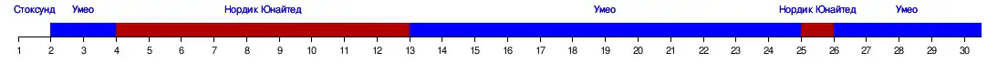 | Нордик Юнайтед | 4 | 3 | 2 | 1 | 1 | 1 | 1 | 1 | 1 | 1 | 1 | 1 | 2 | 2 | 2 | 2 | 2 | 2 | 2 | 2 | 2 | 2 | 2 | 2 | 1 | 2 | 3 | 3 | 3 | 3 |