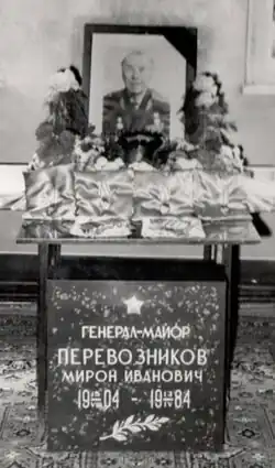 Генерал-майор Мирон Иванович Перевозников 30 сентября 1960 года вышел в запас. Умер 13 апреля 1984 года в Москве[3]. По завещанию был похоронен в родном селе. Его генеральская форма, грамоты, боевые ордена и медали хранятся в музее истории села Красная Поляна[4].