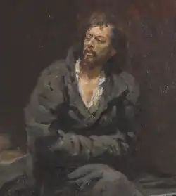 Образ заключённого отражает более сложное психологическое состояние. Он изображён сидящим на краю кровати в наспех запахнутом халате, «руки спрятаны, ворот поднят, арестанта бьёт нервная дрожь», «грудь оголена, на ней нет нательного креста». Положение тела узника неустойчиво из-за того, что, с одной стороны, он пытается «закрыться» от вошедшего священника и явно не испытывает к нему доверие, словно отшатывается от креста с распятием. С другой стороны, приговорённый будто бы задумался о своём будущем решении, его взгляд остановился, он явно смотрит на крест в руках священнослужителя. Узник пытается взять себя в руки, собраться с мыслями и что-то сказать[8]. Он неподвижен — продолжает сидеть на койке, не вставая даже перед протянутым к нему крестом в руке священника, но в то же время именно смертник «активен» и является «действующим» персонажем. Его фигура исполнена энергии, силы и целеустремлённости[11]. В его лице есть явный элемент эгоистической надменности[12][Прим 1].