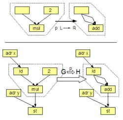 С точки зрения подхода DPO правило переписывания графа это пара морфизмов в категории графов и гомоморфизмы графа между ними: (или ), где инъективно. Граф называется инвариантным или иногда склеивающим графом. Шаг переписывания или применение правила к исходному графу определяется двумя диаграммами кодекартова квадрата, обе ведущими в один и тот же морфизм , где это контекстный граф (откуда и происходит название double-pushout). Другой морфизм графа моделирует вхождение в и называется сопоставлением. Практическим пониманием этого является то, что является подграфом, который сопоставляется из (смотри задачу поиска изоморфного подграфа), и после того, как совпадение найдено, заменяется на в исходном графе , где служит интерфейсом, содержащим узлы и рёбра, которые при применении правила были сохранены. Граф необходим для того, чтобы присоединить образец, сопоставляющийся его контексту: если он пуст, совпадение может обозначать только весь связанный компонент графа .