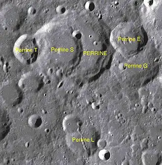 - Образование сателлитного кратера Перрайн T относится к позднеимбрийскому периоду[5].